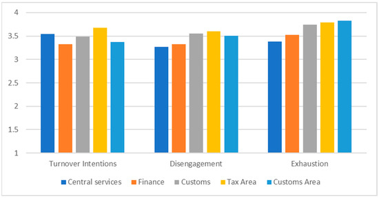 The participants also showed high turnover intentions as well as high levels of burnout, significantly higher than the scale’s central point (3) (Table 2). It is the participants working in financial services who have the highest turnover intentions (Figure 3). Regarding burnout levels, participants working in the tax area reported higher levels of disengagement, and those working in the customs area reported higher levels of exhaustion (Figure 3).