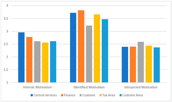 As for motivation levels, the intrinsic and introjected motivation were significantly below the central point of the scale (3), while the identified motivation was significantly above the central point (Table 2). The participants working in central services reported the highest levels of intrinsic motivation (Figure 4). As for identified motivation, the employees who reported the highest levels were those working in finance, and those who reported the lowest were those working in customs (Figure 4). Concerning introjected motivation, the participants working in customs reported the highest levels (Figure 4).