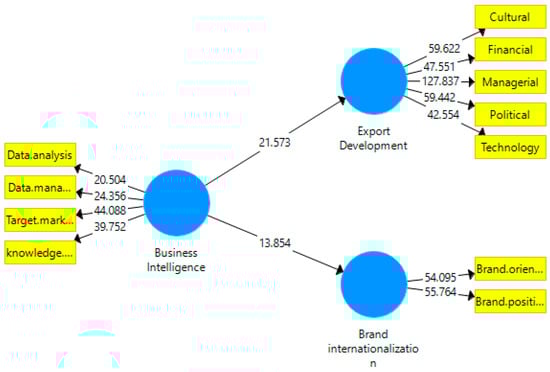 Table 3 and Figure 2 and Figure 3 show the positive effect of applying business intelligence on export development (0.767) (T = 21.573) as well as the positive effect of applying business intelligence on brand internationalization (0.701) (T = 13.854). From these results, H1 and H2 are confirmed.