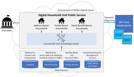 Figure 2 provides a high-level architecture of the Household IPS, which shall be hosted on the Government of Malta Hybrid Cloud Platform17. This IPS shall offer the visualisation of different household unit compositions, which shall be represented as a knowledge graph. The knowledge graph is an integration of different data sources from multiple stakeholders spanning different business domains, such as social security, taxation, and utility retail and supply. The knowledge graph is aligned with existing vocabularies such as core vocabularies, including the core person vocabulary18 and the core location vocabulary19. Service users, i.e., public officers, will use the Household IPS service in order to deliver better public services to the end beneficiaries, i.e., the citizens and residents of Malta.