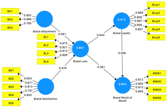All the relationships established between the constructs were significant and positively related. Thus, the results revealed that brand attachment and brand satisfaction positively influenced brand love (β = 0.479 and β = 0.425, respectively), confirming hypotheses 1 and 2. Brand love positively influenced brand loyalty and positive word of mouth (β = 0.415 and β = 0.382, respectively) confirming hypotheses 3 and 4. Finally, brand loyalty positively influenced positive word of mouth about the brand (β = 0.507), confirming hypothesis 5.