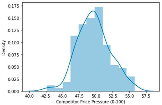 Beyond the typical asking price (cost-plus-margin), the market price in this model was set based on competition price pressure of similar quality lines of products offered in the market. Figure 1 shows a skewed distribution reflecting, for the simulation (all products and the entire period), an average competitor price pressure indicator of 49.6851 (in a 0–100 scale) and standard deviation of 2.4514, unveiling a negative pressure on prices for the analyzed period. Such negative pressure makes the market prices go down, affecting customer expectations and behavior and influencing the negotiating agent in this model. By considering this level of market information, the results are aligned with propositions by () and ().