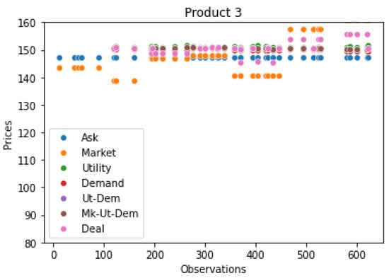 Another aspect derived from the findings of this study is the volatility in price ranges (see Figure 2) across the twenty products present in the simulation and the comparison of deal prices: see Figure 4 stressing product 14, as well as the comparison of means and the ANOVA (Table 2) sections, both bearing statistically significant differences in said prices. Such price volatility and deal price distance represent, together, a powerful attribute of this dynamic pricing agent-based model.