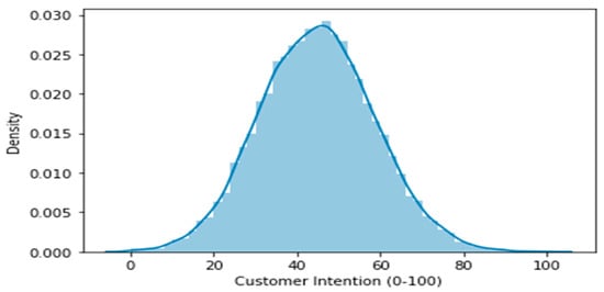 Customer intention is key in this model, as it serves as a proxy for utility-based pricing, and Figure 3 brings relevant data on this. For the entire simulation, all products, and the entire period, the average customer intention was 44.8613 (on a 0–100 scale), and the standard deviation was 13.7905, showing some challenges for deals across the analyzed period.
