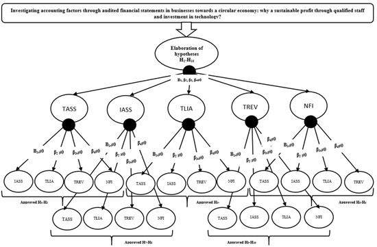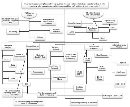 Figure 1 presents the research procedure related to the investigation of accounting factors through audited financial statements in businesses, considering qualified staff and investment in technologies for sustainable profit. Initially, the fulfillment of the research criteria emphasized new technologies, qualified staff, accounting, financial statements, auditing, sustainable profit, etc., while the development of models was carried out through secondary data reported for financial periods for 800 businesses in Kosovo divided according to their activity (production, servicing, and distribution). In this research, analyses (descriptive, factorial, multiple regression, and reliability) were used, validating the raised hypotheses (H1, H2, H3, H4, H5, H6, H7, H8, H9, and H10) for all sessions and all variables (TASS, TLIA, TREV, IASS, and NFI), investigating how many businesses have sustainable profit.