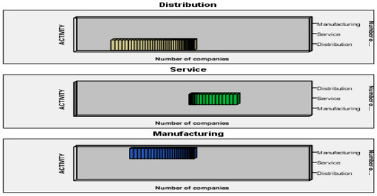 Figure 2 presents the descriptive data for the researched businesses according to the number and types of businesses related to the investigation of accounting factors through audited financial statements, analyzing qualified staff and investments in technology (equipment, machinery, etc.) for sustainable profit according to the number of businesses (N = 800), according to the financial statements (FS = 2 or balance of condition (TASS, IASS, and TLIA), and balance of success (TREV and NFI), as well as according to the activity of businesses (production, service, and distribution). In addition, according to the results of the figure, the largest number of businesses in this research were distribution businesses—in percentage, (N = 352 or 44%).