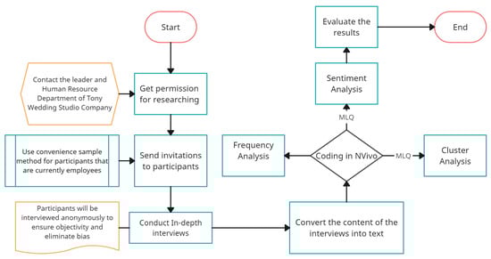 Finally, the results were evaluated to answer the research questions. The findings were interpreted and analyzed to draw conclusions and provide insights into the leadership style of the company’s leader. A flow chart for the designed methodology is shown in Figure 1.