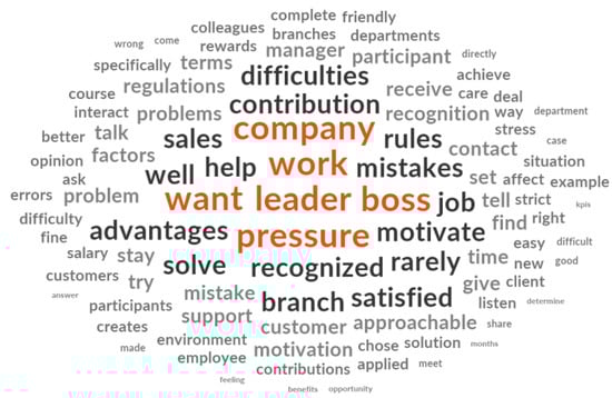 As shown in Figure 2, up to 100 words are displayed in varying sizes, with frequently occurring words appearing in larger font sizes. The main meaningful words in this sample can be identified as “leader” (number one, 12.56%), “work” (number two, 4.39%), “pressure” (number three, 2.36%), “boss” (number four, 1.92%), and “company” (number five, 1.76%).