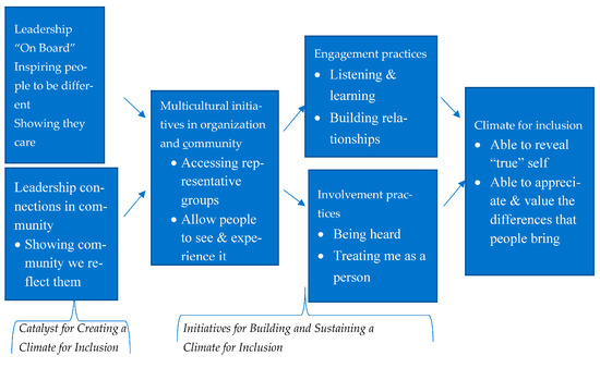 Figure 1 illustrates a framework which emerged as we categorized the responses from our interview data. The framework suggests that developing an inclusive climate is partially related to what leaders can do when acting as a catalyst for change. In addition, the initiatives introduced encouraged multiculturalism and they engaged with and involved people. The first two themes—leadership and community connections—might describe the catalysts which are important for developing a climate of inclusion.