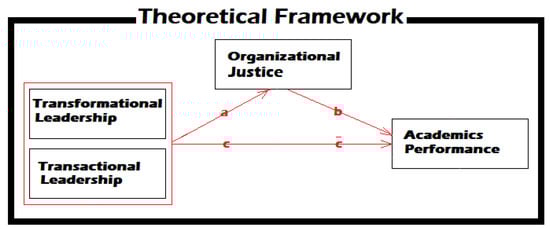 The leadership (head of departments) is effective in managing efforts and the potential of followers (academics) overwhelmed at anticipated outcomes related to administrative will (determination) and academic outcomes (success) through dynamic culture (Khan et al. 2019). These are the leading and influential factors (leadership, justice, and performance), along with certain other influential factors (academic, economic, and political), which are vital for institutional performance (Khan et al. 2020). Organizational justice refers to employees’ perceptions of fairness and equity in the workplace. It involves evaluating how well an organization treats its employees, including distributive justice (fairness in the distribution of rewards), procedural justice (fairness in decision-making processes), and interactional justice (fairness in interpersonal treatment). The literature on transformational leadership and organizational justice suggests that transformational leaders are more likely to promote a sense of justice and fairness in the workplace (Purwanto et al. 2020). This is because transformational leaders are known to inspire and motivate their followers to go beyond their self-interests, and they often encourage a shared sense of purpose and values (Alamir et al. 2019). In this connection, leadership through different styles has been widely researched toward performance through certain facilitative parameters, such as organizational justice with diverse outcomes (Khan et al. 2021a). Similarly, transactional leadership has also been found to be positively associated with organizational justice, and organizational justice has been found to mediate the relationship between transactional leadership and employee performance (Khan et al. 2021b). This suggests that transactional leaders who provide clear expectations, feedback, and rewards are more likely to have employees who perceive their workplace as fair and perform better as a result. Moreover, some studies have found that organizational justice can also partially mediate the relationship between transformational (Thompson et al. 2021; Rokhman 2011) and transactional leadership and employee performance. This suggests that both transformational and transactional leadership may influence employee performance through the creation of a fair and just workplace. Therefore, this study is an “effort to examine the leadership” styles, organizational justice, and performance in the context of higher education institutions. The structure of the paper comprises five parts. Part one consists of introducing the concept of this current research study along with the research objective. Part two comprises a literature review to link the relationship between criterion and outcome variables as well as the mediating role of organizational justice. Part three comprises a detailed methodology along with instruments for data collection and statistical procedures as well as ethical standards for conducting this current study. Part four presents a detailed discussion of finding through the Hayes statistical models, while part five culminates in the presentation of the conclusion, contributions, and recommendations of this current study.