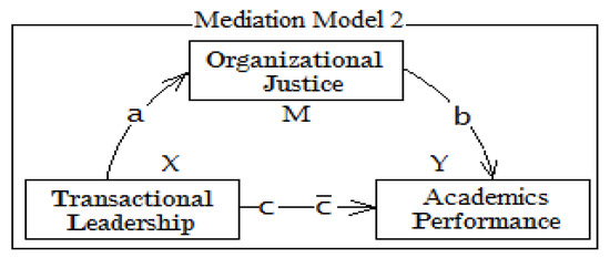 - The testing of hypothesis about the mediation of the variable confirms that the mediator is significantly supporting the predictor in bringing variation in the criterion variable. Similarly, the second model of mediation analysis also gives figures representing the partial mediation role of organizational justice, thereby strengthening the relationship between predictor (transactional leadership) and criterion variables (academics’ performance) from (1.0597) is (0.6271), thus confirming the partial mediation.