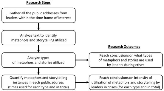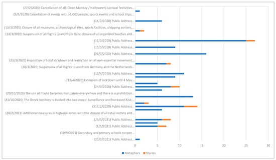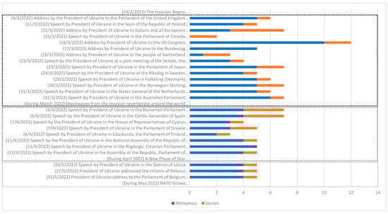 Based on the above, in the present paper, we focus on the following research question: “What types of metaphors and storytelling techniques do political leaders use in contemporary times of crises, and to what extent? Does the intensity with which political leaders use metaphors and stories fluctuate based on the severity of the crisis faced?”. In order to address this question, we have identified two contemporary political figures that have been noted as having been particularly successful in conveying their intended meaning as well as persuading their audience towards specific actions: (i) The PM of Greece, whose communication strategy led to international recognition of the effective management of the first lockdown period during the COVID-19 crisis (with minimal casualties and maximum compliance to the isolation and containment measures), and (ii) the President of Ukraine during the initial stages of the ongoing (2022–2023) conflict with Russia, who managed to convince the parliaments of European countries through his speeches to align with and provide their support to his country. The two politicians’ statements and/or public addresses were gathered and their content was analyzed in order to identify patterns of usage in metaphors and storytelling (twenty-one public statements of the Greek PM addressed to the Greek people in the context of the COVID-19 crisis, and twenty-five addresses of the Ukrainian President to international parliaments in the context of the conflict in Ukraine). According to the attained results, we find that extensive usage of both metaphors and storytelling has been recorded through their speeches. Specifically, we recorded more than one hundred and fifty metaphors and fourteen stories in the Greek PM’s speeches, and more than one hundred metaphors and thirty-six stories in the Ukrainian president’s addresses. Moreover, by analyzing the different types of metaphors and stories within the analyzed speeches, we provide a quantitative account of the intensity with which each of these tools was employed.