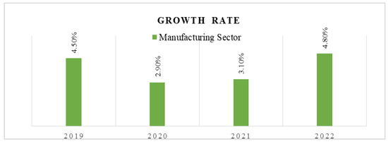 The percentage of growth rate of the Malaysian manufacturing sector for 2019, 2020, 2021, and 2022; Source: Department of Statistics Malaysia (DOSM) (2021) and Department of Statistics Malaysia Official Portal (2022).