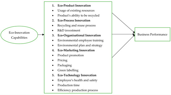 The manufacturing sector in Malaysia is responsible for and must take action on 30 percent of the emissions of harmful and dangerous gases (Ch’ng et al. 2021). Adam and Alarifi (2021) declared that a company’s strategy and the innovation practices implemented by SMEs aim to tackle the challenges presented by any unexpected circumstances in the near future and beyond. To increase the quality of green products, manufacturing companies must implement eco-innovation capability in every process or product they manufacture. These practices will aid in sales growth and profitability, allowing SMEs to remain competitive in the market and industry sector while performing better in the industry. In fact, business performance has a significantly positive relationship with eco-innovation. This was proven in previous studies regarding the relationship between business performance and eco-innovation (Cheng et al. 2014; Dong et al. 2014; Geng et al. 2021; Yin et al. 2022). Eco-product innovation, eco-process innovation, eco-organisational innovation, eco-marketing innovation, and eco-technology innovation were classified as the main findings of the study, as Malaysian SMEs were shown to be capable of adapting any of the capabilities within their organisation.
