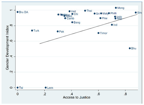 Figure 1 and Figure 2 indicate the diagrammatical representation of the major variables of the current study, which are the Gender Development Index, Access to Justice, and Economic Complexity. The graph indicates that, with the increase in Access to Justice and Economic Complexity, people will invest in health, education, and economic activity and remove the gender gap from among them. Along with this, most females work in the unorganized sector of the economy, frequently in dangerous situations with no social protection. Therefore, strong institutional factors could improve gender equality. Economic complexity will not only increase the income of the individual by producing diversified products, but also the diversification of products in accelerating the human development through technological advancement. The graph of Access to Justice (Figure 2) shows a highly positive impact on GDI, as with the increase in Access to Justice, females and underprivileged women of the society obtain a chance of contributing to the society’s development and hence there will be an improvement in the Gender Development Index in 24 Asian countries. Moreover, Table A2 of the Appendix A indicates the Global Gender Report, which examines the state of gender equality in countries around the world. The report provides data and analysis on a range of indicators related to gender equality, including economic participation and opportunity, health and survival, educational attainment, and political empowerment. According to its statistics, 13 of the 23 South Asian nations have improved their ranking by promoting gender equality. By giving citizens equal opportunities, countries are making progress in closing the gender gap. Laos is the only nation whose score increased; it rose by 0.017 points, joining the Philippines as the highest-scoring nation.