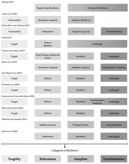 Although this categorization uses transformation as the overarching aspect, several authors use nascent concepts such as ecological resilience, transformability, antifragility, transformative capacity, transformative resilience, and the growth domain. The transformation was chosen as it strongly represents the fundamental change component thus giving the aspect a more actionable nature.