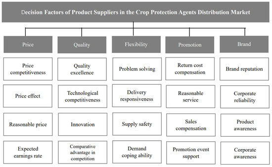 For this reason, ‘Quality’ in the study refers to a factor of competitive competency for the product quality of suppliers. ‘Price’ denotes the level of a customer-friendly pricing policy that affects the decision of product suppliers. ‘Flexibility’ was defined as a factor that indicates how actively a supplier responds to difficulties in retail distribution, such as emergency demand response and problem-solving support. ‘Promotion’ is support for sales activities or preservation of related costs that impact the determination of product suppliers. The “Brand” factor was defined as a brand-related factor that affects crop protection distributors to determine product suppliers, which includes recognition of and trust in companies, reputation, and recognition of products. A total of 20 detailed sub-variables were constructed around these five core areas (refer to Table 2).