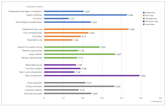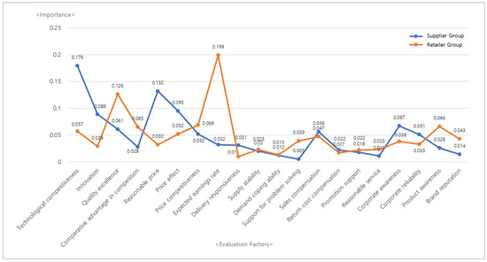Table 6 and Figure 5 show the results of the comparison and analysis of detailed factors between the two groups. The manufacturing supplier group identified technical competitiveness (0.179), appropriate price (0.132), price effect (0.095), innovation (0.089), corporate awareness (0.067), quality excellence (0.061), sales compensation (0.056), price competitiveness (0.052), and corporate reliability (0.051) as the significant factors. On the other hand, the distributor group had different selection factors, where expected return (0.199), quality excellence (0.066), price competitiveness (0.066), comparative competitive advantage (0.065), technical competitiveness (0.057), price effect (0.052), sales compensation (0.047), and brand reputation (0.043) were identified as significant factors.