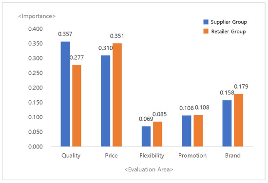 Table 5 and Figure 4 show the results of the comparison and analysis of the supplier group and the retail distribution group. The manufacturing supplier group ranked quality (0.357), price (0.310), brand (0.158), promotion support (0.106), and flexibility (0.069) in order of importance. On the other hand, the retail distribution expert group ranked price (0.351), quality (0.277), brand (0.179), promotional support (0.108), and flexibility (0.085) in order of significance. The first and second priorities were divided between the two groups in quality and price, respectively, while the other three factors showed the same priority.