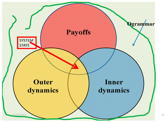 The system state is not an equilibrium state. It shows where an organisation happens to be at a moment in time. It is an intersection of dynamics, payoffs, and grammar. Note that the system state is not a point but an area. We should think of the system state indicated in the diagram as a vector that includes the relevant aspects of inner and outer dynamics, grammar, and payoffs that exist at a point in time.