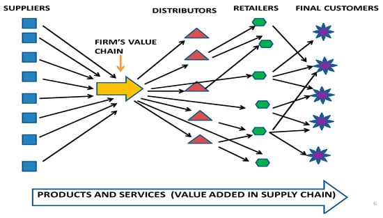 The nodes are suppliers (raw materials and energy, equipment, labour, management and so on), the firm’s value chain in question (showing how it adds value), distributors, retailers, and final customers. As demonstrated in Figure 5, connections summarize transforming inputs from suppliers into outputs distributed to final customers, distributors, and retailers (Elsaleiby 2019).