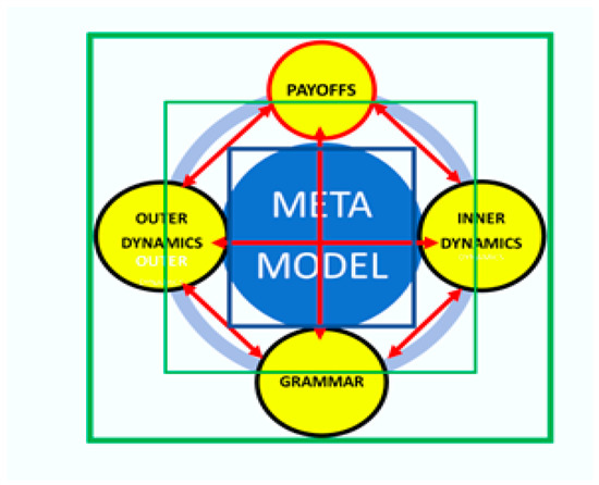 The term meta is used because (as we see below) many economic and management models relate to one or other of the categories of the meta-model. This picture is rather misleading in that it treats the four elements of the meta-model separately. No diagram can give a complete picture, but the purpose of Figure 9 is to relate the meta-model to some of the standard economic/strategic models (Koutsopoulos et al. 2020; Boritz and White 2016).