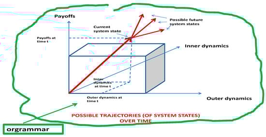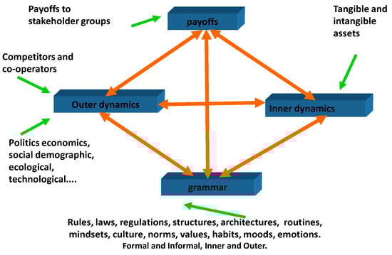 As shown in Figure 2, the state of an organisation in the present time is represented as an intersection of inner and outer dynamics with payoffs, all expressed in the context of grammar. Inner dynamics (ID) are an organisation’s assets, capabilities, and competencies. Outer dynamics (OD) include forces of competition and cooperation, and interacting macro forces; economic, environmental, governmental, legal, technological, and so on (Tlemsani 2010, 2020; Tlemsani and Matthews 2010; Tlemsani et al. 2022).