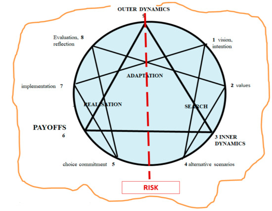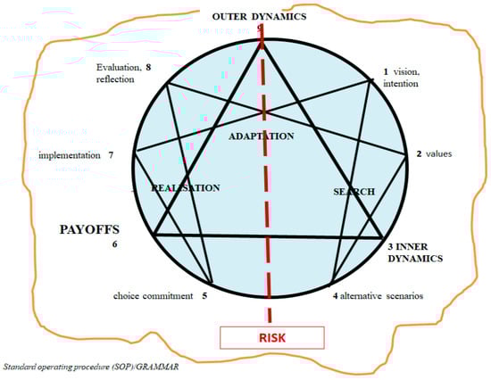 Creativity probably cannot be taught. However, it can be encouraged. The Strategic Enneagram as a mandala is a way of evoking creativity in individuals and groups. It incorporates strategy, mindfulness, and creativity (Kam and Fluit 2021; Kam 2022). The phrase strategic process is a series of states of a system over time. Thus, we begin by considering the process which we think of as being to some extent deliberate and second the state itself, represented by the inner triangle in Figure 3a. In Figure 3, both the process and system state are embedded in grammar. The process is traced out by the hexagram 1, 4, 2, 8, 5, … It has a cognitive aspect (1, 4, 2), an implementation aspect (8, 5, 7), and, since the situation is dynamic and adaptive, a learning process (7, 1) relating what is implemented to what is intended and what values were intended and what was achieved (2, 8). The enneagram is symmetric around risk which arises when the purely cognitive is implemented. Purely cognitively, anything is possible.