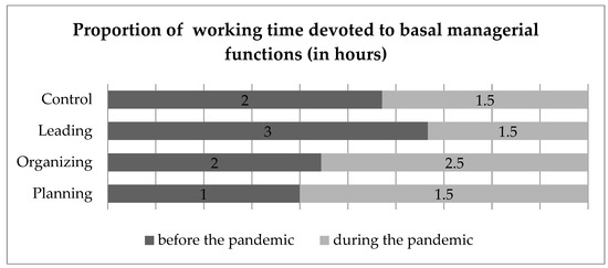 To explore the changes in the dominance of each management function, time management comparison was selected as the primary approach to measure the changes in working time dedicated to performing tasks before and during the pandemic. Economic managers were asked to provide the approximate number of hours they had dedicated to management tasks before the pandemic and then during the pandemic. The data indicate that significant changes occurred in the number of hours per working day during which economic managers performed a management function (Figure 1).