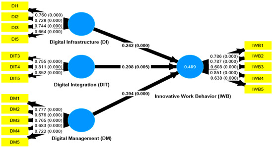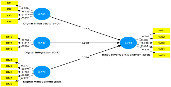 Furthermore, a 5-point Likert scale was used to understand the behavior of the constructs through the descriptive statistics of the questions that compose them. According to Table 9, the average, median, minimum, maximum, and standard deviation of each question are verified. Regarding the Digital Infrastructure (DI) construct, all questions (DI1, DI2, DI3, and DI5) are close to scale 4. Regarding the Digital Integration construct (DIT), one question (DIT3) is close to scale 4, and two questions (DIT4 and DIT5) are close to scale 3. Regarding the construct of Digital Management (DM), all questions (DM1, DM2, DM3, DM4, and DM5) are close to scale 4. Finally, in the construct Innovative Work Behavior (IWB), all questions (IWB1, IWB2, IWB3, IWB4, and IWB5) are close to scale 4. Additionally, when analyzing Table 10, it is possible to observe that the four constructs (Digital Infrastructure, Digital Integration, Digital Management, and Behavior of Innovative Work) had an average of around 4 (DI = 4.328; DIT = 3.569; DM = 4.230; IWB = 4.052) and the median of all constructs were close to the means (DI = 4.750; DIT = 3.667; DM = 4.400; IWB = 4.200). None of the constructs obtained averages lower than the midpoints of the scales.