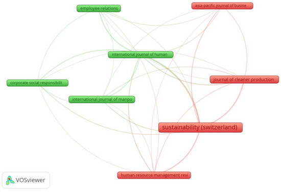 The bibliographic coupling mapping of the data revealed well-established connections. To refine the data the author fixed the criteria to a minimum citation of 25 to obtain more insightful articles. Out of 247 documents, 50 meet the criteria shown in the heat map. The five well-defined clusters were identified, shown in red, blue, green, yellow, and purple in Figure 4. These signify publications which are strongly connected through references. The results suggest, as shown by the heat map, that all publications have strong connections with each other except Stachová et al. (2019), which shows weak connections. The red cluster includes 16 documents in which Jackson et al. (2011) have the highest citations, the green cluster includes 13 documents in which Baum et al. (2016) have the highest citations, the blue cluster includes 10 documents in which Kramar (2014) has the highest citations, the yellow cluster includes 5 documents in which De Prins et al. (2014) has the highest citations, and the purple cluster includes 3 documents in which Stankevičiūtė and Savanevičienė (2019) have the highest citations. The bibliographic coupling analysis of sources specifies which journals had published sustainable HRM papers during the study period. The criteria were fixed to at least 3 articles per journal and a minimum citation score of 25; out of 105 sources, only 13 met the threshold. Figure 5 shows the stronger circle and connectivity around the Sustainability journal. Some other journals were specified with smaller circles. The bibliometric coupling analysis of the source revealed that “Sustainability (Switzerland)” was the highest number of publications and highest link strength, as mentioned in Table 7.