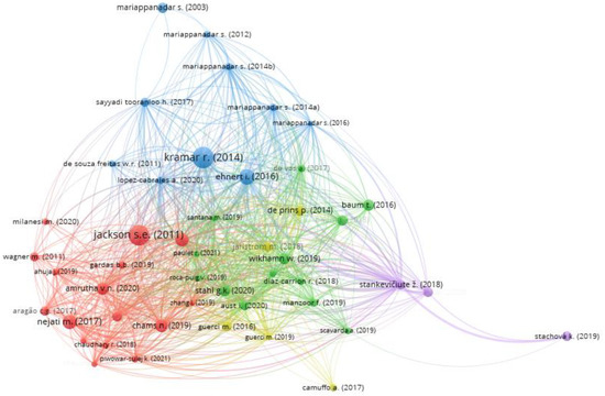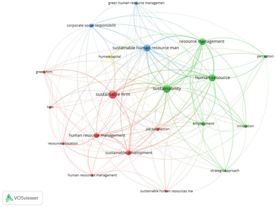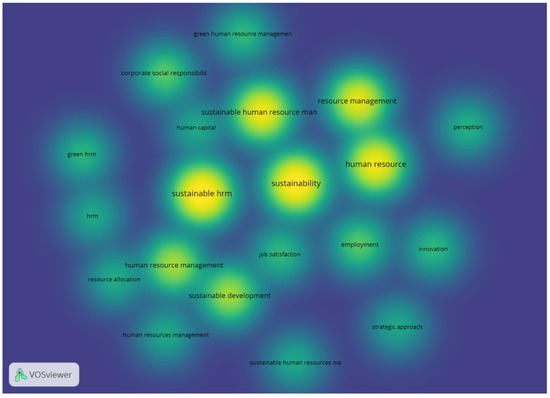 Figure 6 highlights that the keyword co-occurrence heat map of sustainable HRM presents different density values. A highlighted density yellow color specifies more frequent use of the concept. “Sustainable HRM” and “Sustainability” represent the highest yellow color density. Therefore, it indicates that these are the main keywords in sustainable HRM research. Afterwards, other keywords such as “Human Resource Management”, “Sustainable development”, and “Corporate social responsibility” illustrate that sustainable HRM connects with HRM and the objectives are the sustainable development of an organization with the attainment of corporate social responsibility.