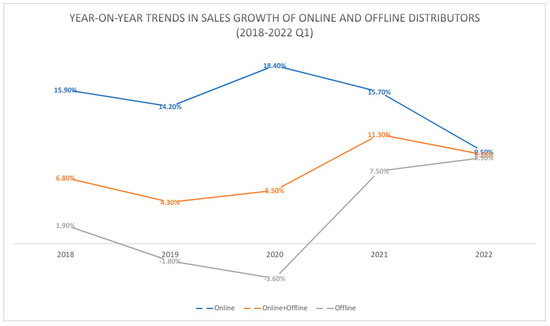 Figure 2. Year-on-year trends in sales growth of online and offline distributions (South Korean Ministry of Trade, Industry and Energy 2023).