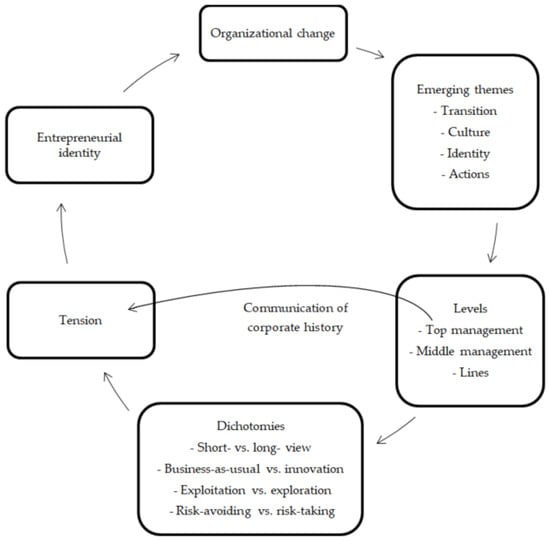 This paper presents a proximal study of energy transition in a large state-owned enterprise. Organizational change is the prerequisite for energy transition in a company that has historically understood its own identity in the remunerative oil gas industry. The methodology of the research is a qualitative on-field study of the implementation of the transition strategy inside the company. For this purpose, the research uses primarily first-hand reports collected within the organization in the years 2018–2020. The paper explores the dynamic process of change to reveal the tensions, conflicting identities, and strategies of implementation needed to start the energy transition, shedding light on the formation of a new corporate identity that traces back to the entrepreneurial inception of the company. The role of communication between the different levels of the company was crucial. The management found in the corporate history a moderator of organizational change that led to a renewed entrepreneurial identity. This paper brings evidence that a re-interpretation of the corporate identity is a condition that eases the process of organizational change. The results of the study will provide the theory with a practical case in order to better understand the transitions of state-owned enterprises in their effort to promote organizational change and drive sustainable innovations.