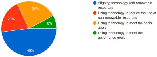 Furthermore, as presented in Figure 1, 48% of respondents reported that technology was being used in their firm in relation to renewable resources. Another 20% (5 out of 25 respondents) uses technology to reduce non-renewable resources. Interestingly, 24% (6 out of 25 respondents) uses technology to address goals relating to social aspects, such as diversity and philanthropy. Only 8% (2 out of 25 respondents) uses technology to meet governance goals. This percentage depicts the absence of links between private organizations and governmental services, and the possible lack of infrastructure to enable collaborations in the field of technology between private firms and the government. Additionally, despite the lack of specialized sustainability schemes in individual departments, the findings reveal a degree of sustainability awareness among top managers in firms in the Indian service sector, hence the existence of generic sustainability frameworks.