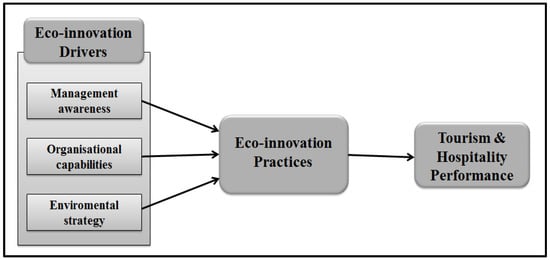 The conceptual framework of this study (see Figure 1) examines eco-innovation practices as a mediator in the relationship between the drivers of eco-innovation and the performance of tourism and hospitality enterprises.
