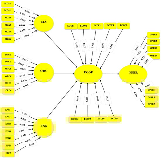 Consequently, the results showed that management awareness indirectly influences tourism and hospitality enterprise performance (β = 0.316, t = 4.345, p < 0.01, CI: 0.162–0.243); thus, the fifth hypothesis (“eco-innovation is mediating the relationship between management awareness and tourism/hospitality performance”) is confirmed. In addition, organizational capability indirectly influences tourism and hospitality enterprise performance (β = 0.248, t = 4.451, p < 0.01, CI: 0.143–0.235) through eco-innovation practices; thus, the sixth hypothesis (“eco-innovation is mediating the relationship between organizational capabilities and tourism/hospitality performance”) is also supported. Additionally, environmental strategy indirectly impacts tourism and hospitality performance (β = 0.142, t = 3.521, p < 0.01, CI: 0.132–0.148), and this result shows that the seventh hypothesis is accepted and confirms the mediating role of eco-innovation in the relationship between environmental strategy and tourism/hospitality enterprise performance. This indicates that the effect of the three direct variables (eco-innovation drivers including management awareness, organizational capabilities, and environmental strategy) is positive and has an effect when integrating the mediating variable (eco-innovation practices) (see Table 6).