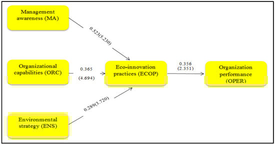 Coefficients of determination (R2) and the significance of paths were used for data analysis, with the results showing that eco-innovation is influenced by the MA, ORC, and ENS variables (see Table 5 and Figure 3). The results showed that all eco-innovation drivers, including management awareness (MA), organizational capabilities (ORC), and environmental strategy (ENS), have a significant effect on eco-innovation practices. First, managers’ awareness of eco-innovation has a positive effect on eco-innovation practices (β = 0.523, t = 5.230, p < 0.001). The path coefficient between them is high, and this study therefore supports the alternative hypothesis and rejects the null hypothesis. Second, the path coefficient between an organization’s capabilities and eco-innovation practices (β = 0.365, t = 4.694, p < 0.001) shows a significant effect between them; thus, the alternative hypothesis was also supported. Third, the path coefficient between environmental strategies and eco-innovation practices (β = 0.365, t = 4.694, p < 0.001) is significant. Fourth, eco-innovation practices have a positive and significant effect on tourism and hospitality enterprise performance (β = 0.356, t = 2.351, p < 0.001).