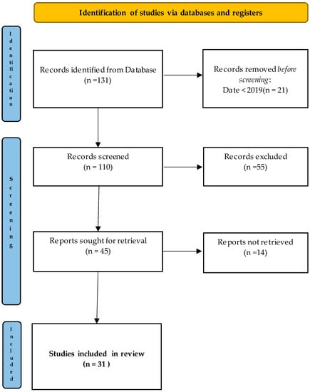 Thorough search of the Web of Science database was conducted in June 2023. The equation finally used was: (tourism or hospitality) and (“artificial intelligence” or AI or robotic) in title, abstract, author keywords, and keywords plus. Later, the search was refined by document type (review article). A total of 131 manuscripts were identified. Once the inclusion and exclusion criteria were applied, the literature search resulted in 110 citations. Evidence screening was later carried out based on title and abstract examination. The two researchers worked in pairs and sequentially evaluated the titles and abstracts of the publications identified in the search as potentially relevant. Discrepancies in study selection and data extraction were resolved through consensus and discussion. After screening, 55 of the results were eliminated due to their inability to meet the objective of the study. A total of 14 reports were not retrieved, and, in conclusion, 31 documents were included in the qualitative synthesis. Figure 1 shows the inclusion decision flowchart with the steps of the review decision process (identification, screening, retrieval, and inclusion) according to the PRISMA (Preferred Reporting Items for Systematic Reviews and Meta-Analyses) standard: