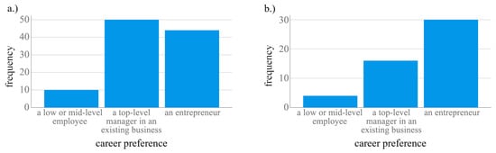 Career preferences of (a) first year bachelor students and (b) second year master students based on completing the statement: “I would feel most comfortable being…”. Source: dataset analysis.