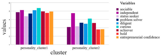 As a result of hierarchical cluster analysis using the Ward method, followed by k-means cluster analysis, the 154 business students are split into two clusters based on the personality variables (with the exception of ideator, which is not significant for clustering), as presented in Figure 2.