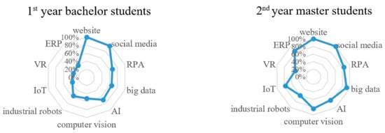 The 154 students were asked if they would be able to give an example of a situation in which each of the following ten technologies could improve a company’s results, without having to look them up: (1) a website, (2) social media presence, (3) software automation (robotic process automation software—RPA), (4) big data, (5) artificial intelligence (AI), (6) computer vision, (7) industrial robots, (8) internet of things (IoT), (9) virtual reality (VR), (10) enterprise resource planning (ERP). The possible answers to this question are either “yes” or “not sure”. The reliability score of this section is 0.754 > 0.7 considering all answers, 0.723 for bachelor students and 0.736 for master students.