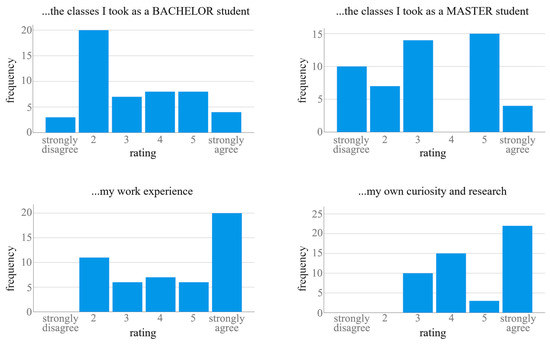 Moreover, second year master students were asked to rate on a scale from 1 to 6 (1 = “strongly disagree”, 6 = “strongly agree”) four sources of knowledge on technology’s utility for companies, as presented in Figure 4. The four diagrams represent the distributions of responses connected with as many options offered. The reliability score of this section is 0.734 > 0.7.