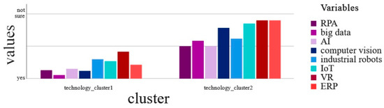 Technology_cluster1 has 94 cases, comprising students who tended to report they are able to give an example of a situation in which each of the ten technologies mentioned in this paper could improve a company’s results, without having to first search for information about them. Technology_cluster2 has 60 cases, comprising students who tend to be “not sure” about how eight of these technologies can help businesses. The distribution of bachelor students between technology_cluster1 and technology_cluster2 is 51:53, and for the master students it is 43:7.