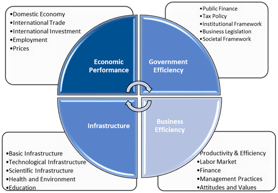 The International Institute for Management Development (IMD) proposes the following factors (see Figure 1) for the elaboration of the World Competitiveness Yearbook (WCY) (IMD World Competitiveness Ranking 2021), which it has been compiling since 1989: Economic Performance, Government Efficiency, Business Efficiency, and Infrastructure. This global competitiveness ranking is based on 334 competitiveness criteria.