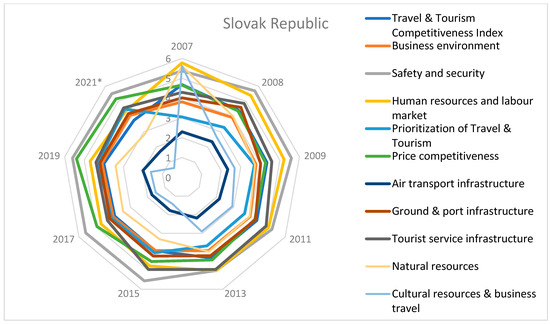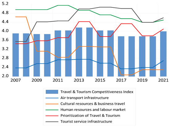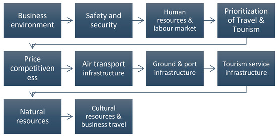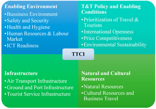 The competitiveness in tourism (Luštický and Štumpf 2021, p. 100792) of each country is measured by the Competitiveness in Travel & Tourism Index, which analyzes four macro-categories of variables for each country: the set of enabling environments that captures the conditions necessary to operate in a country; the set of laws and policies governing the sector, business context, infrastructure, and ITC Readiness; and, finally, human, cultural, and natural resources, which are further detailed in 14 competitiveness factors, including environmental sustainability, safety, the priority given to tourism in national policies, air transport infrastructure, and so on (Rodríguez-Díaz and Pulido-Fernández 2019, p. 51). Tourism competitiveness is measured by the four areas of the environment that surround business and markets, tourism policy, hospitality infrastructure, and natural and cultural resources and 14 elements and 90 indicators that subdivide them. The World Economic Forum (GEF) shall develop an appropriate composite indicator as an unweighted average of the indicators, pillars, or sub-indices included in the immediately preceding level (Rodríguez-Díaz and Pulido-Fernández 2019, p. 51).