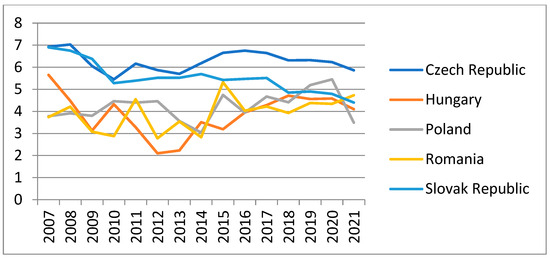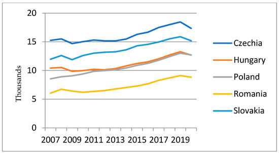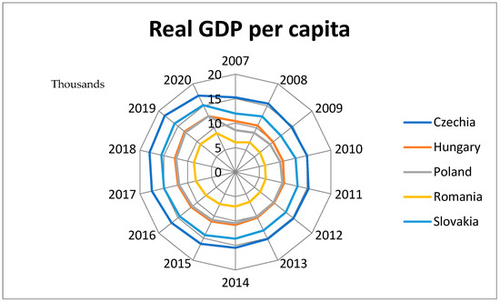 Thus, Figure 5 shows that the Czech Republic records the highest standard of living during the entire period considered in the study, followed by Slovakia, Hungary, and Poland. Also, we can remark in a negative sense that during the entire analyzed period, namely, 2007–2020, the lowest standard of living was registered in Romania.