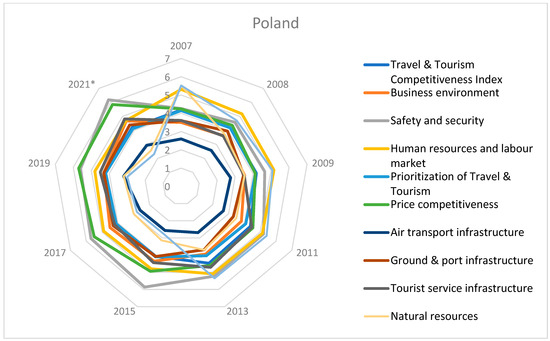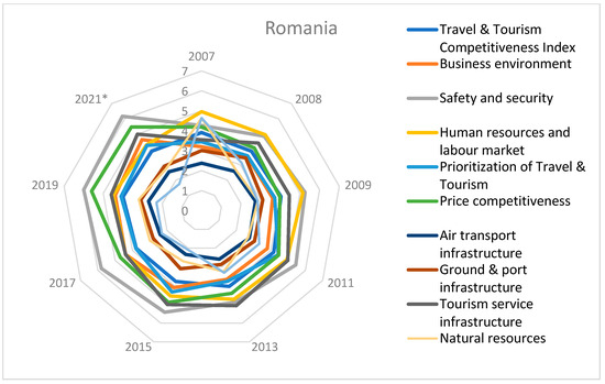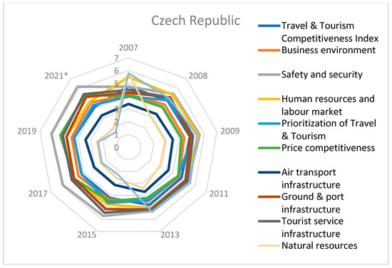 Thus, for the Czech Republic, the statistical data extracted and processed from the Tourism Competitiveness Report 2007, 2008, 2009, 2011, 2013, 2015, 2017, and 2019 and based on the estimation of 2021 values using the simple linear regression method can be centralized in Table 5 and graphs as in Figure 9.