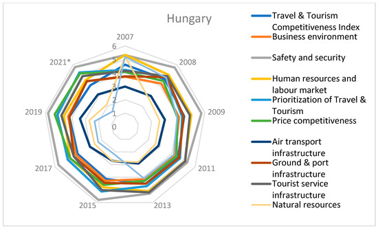 For Hungary, the statistical data extracted and processed from the Tourism Competitiveness Report 2007, 2008, 2009, 2011, 2013, 2015, 2017, and 2019 and based on the estimation of 2021 values using the simple linear regression method can be centralized in Table 6 and Figure 10.