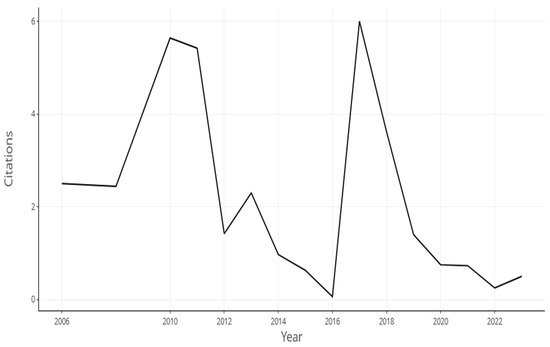 Regarding the average number of citations per year, the scientific output concerning the use of art in an organizational context experienced its peak in 2010, and it reached an even higher level in 2017, with an average of six citations per year. However, there has been a decline in the number of citations from 2017 onwards (Figure 2).